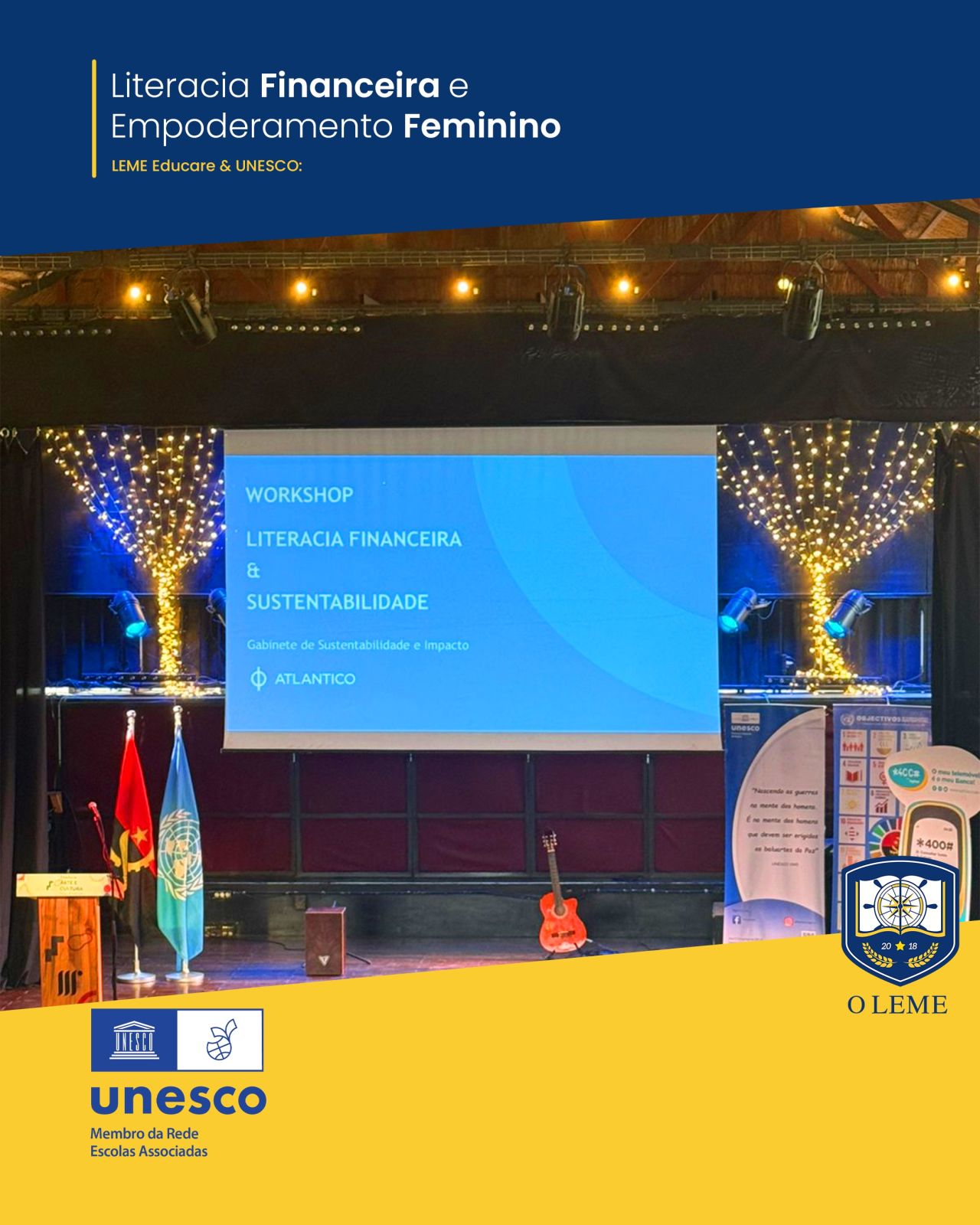 No dia 4 de setembro, o Leme Educare esteve presente na Sessão de Literacia Financeira dedicada a mulheres empreendedoras, realizada na Fundação Arte e Cultura, no âmbito de uma iniciativa da UNESCO: Comissão Nacional de Angola, em colaboração com o Banco Atlântico.
